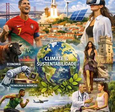 Lisboa, Portugal — Uma nova composição visual está a captar a atenção de especialistas, líderes de opinião e plataformas digitais ao apresentar, num único quadro, os grandes eixos que moldam o futuro global: sustentabilidade, tecnologia, economia, desporto, cultura, saúde e moda. A imagem destaca-se pela sua força simbólica e pela capacidade de sintetizar, de forma clara e aspiracional, os desafios e oportunidades que marcam a próxima década. No centro da composição surge o tema Climate & Sustentabilidade, representado por elementos naturais e pelo planeta Terra, reforçando a urgência da transição ecológica e o papel das novas gerações na construção de um futuro mais responsável. À volta deste núcleo, distribuem-se ícones de progresso: energias renováveis, robótica, realidade virtual, inovação médica, desporto de alta performance, moda contemporânea e infraestruturas culturais. A presença simultânea destes elementos cria uma narrativa visual que simboliza um mundo em transformação — onde tecnologia e humanidade coexistem, onde criatividade e ciência se cruzam, e onde a sustentabilidade deixa de ser tendência para se tornar fundamento. Analistas de comunicação descrevem esta imagem como “um manifesto visual do futuro”, capaz de traduzir, de forma imediata, a interligação entre setores que antes eram vistos como independentes. Hoje, representam um ecossistema integrado que define o posicionamento de Portugal no panorama internacional. Com forte impacto estético e conceptual, esta imagem está a ser reconhecida como uma das representações mais completas da visão contemporânea sobre inovação, responsabilidade ambiental e evolução social.